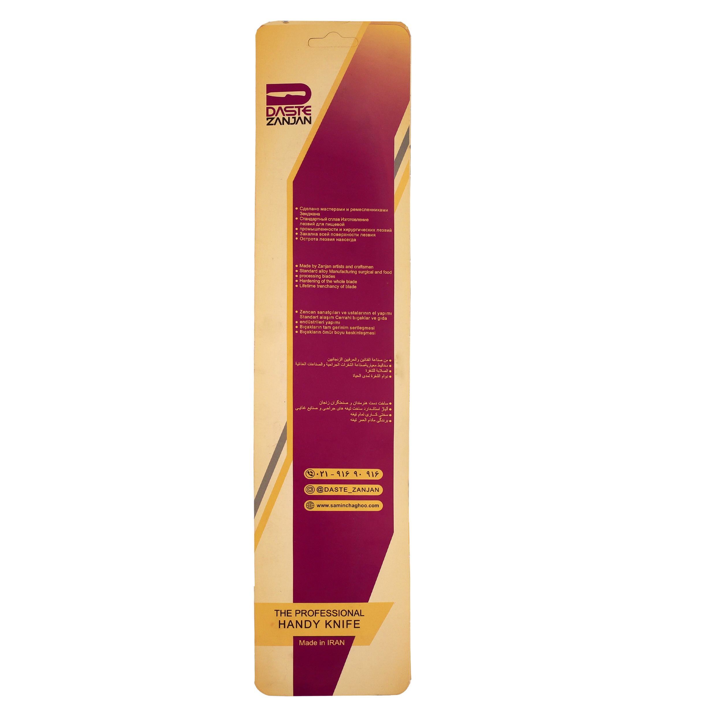 چاقوها جز ابزار اصلی آشپزخانه هستند و تمام مراحل برش و خورد کردن مواد غذایی از طریق آن انجام می‌شود، پس باید چاقویی را انتخاب کرد که جنس مرغوب، بادوام داشته باشد و کارکردن با آن نیز آسان باشد. چاقوها شکل و سایزهای گوناگونی دارند و باید براساس نوع آشپزی و کاربردی که برایمان دارد چاقوی مورد نظر را انتخاب کنیم. گاهی اوقات در اثر خوردن کردن مواد غذایی، تیغه چاقو کند می‌شود در این زمان استفاده از یک چاقو تیز کن به کمک ما می‌آید. چاقو آشپزخانه ثمین دست زنجان مناسب با نیاز در هر خانه‌ و آشپزخانه‌ای تولید شده است. طول چاقو 35 سانت با طول تیغه طول تیغه: 21 سانتی‌متر و ضخامت تیغه 3 میلی متر و وزن 255 گرم است. تیغه این چاقو دست ساز و از آلیاژ ساخت تیغهای جراحی می باشد و کیفیت بالایی دارد. داشتن همزمان چند فاکتور مهم مانند کیفیت، زیبایی و خوش ساخت بودن، از این کالا یک محصول منحصر به فرد ساخته است.